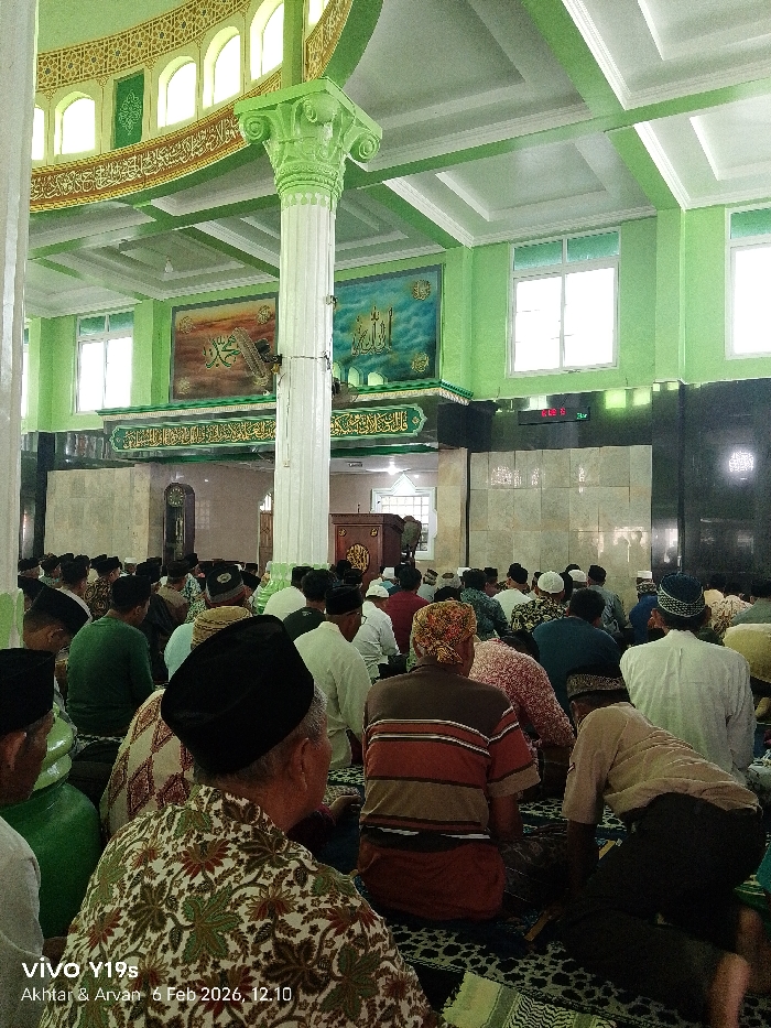 A mosque's interior is filled with men praying. Walls are painted a light green, adorned with decorative paintings above a dark marble section. The ceiling features a light green decorative design, matching the pillars. Natural light filters through windows. The scene captures the atmosphere of a communal prayer service.