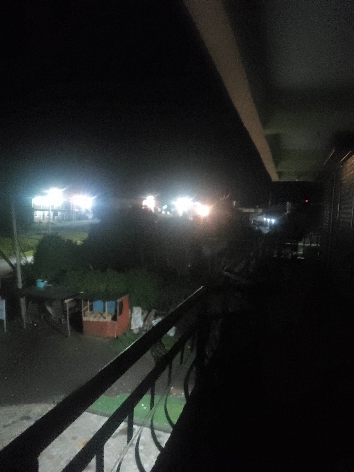 The image displays a nighttime scene in Njoro ward, Kenya, captured from an elevated perspective. In the foreground, a dark metal railing with ornamental scrollwork is visible, extending diagonally from the lower left towards the mid-right. Beneath the railing, a faintly illuminated green surface is present. An overhead, light-colored structural beam or soffit traverses the upper portion of the frame diagonally from left to right. The midground features a small, partially discernible structure, appearing reddish-brown with a blue section, resting on dark ground that reflects light, suggesting wetness. An indistinct object, possibly a container, is situated to the left of this structure. Dense, dark green foliage occupies the space behind it. The background is characterized by numerous intense artificial light sources. On the far left, a multi-story building is brightly illuminated by several white lights. To its right, additional clusters of bright white and yellow lights are visible, indicating other structures or activity. The sky is dark, and no individuals or explicit actions are discernible within the frame.
