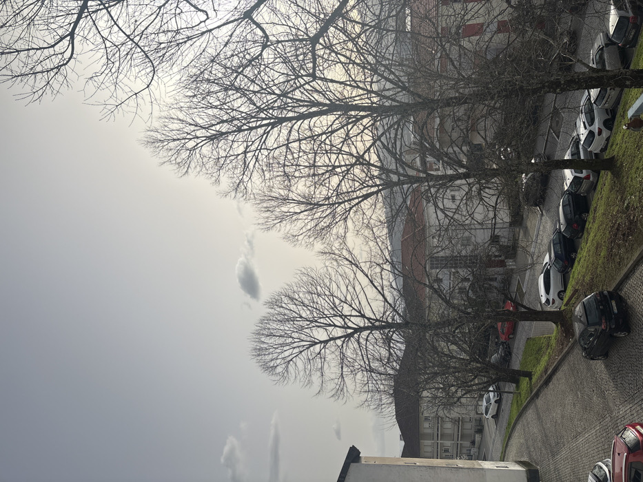 An elevated, downward-angled view captures a street scene in Vila Real, Portugal, under a hazy, bright sky with scattered cumulus clouds. The foreground is dominated by the skeletal branches of several tall, bare deciduous trees, silhouetted against the bright sky, suggesting winter or early spring. Below, a cobblestone street curves gently downhill from the center-left. Numerous vehicles are parked along the street and on grassy verges. Prominently in the lower-left, a black Volkswagen Golf hatchback is parked on the cobblestone street, facing away from the viewer. A red vehicle is partially visible in the immediate bottom-left. Other parked cars include white, black, and silver sedans and hatchbacks. On the left, a multi-story building with white facades and several windows is partially visible. Across the street, several similar multi-story residential buildings with white exteriors and red-tiled roofs are evident, some featuring balconies. Patches of green grass line the street edges where cars are parked. In the far background, a hazy outline of hills or mountains is visible. A single individual, clad in dark clothing, is partially visible near the lower right corner, standing on the street level, obscured by a tree trunk and a parked vehicle.