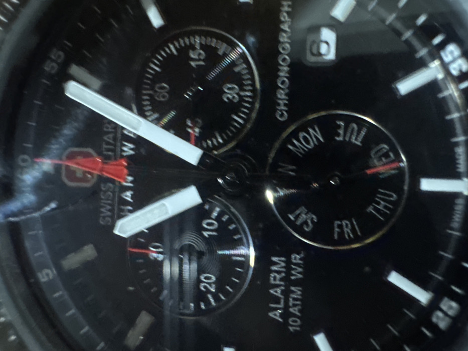 - "The image provides a detailed, close-up, and slightly out-of-focus view of the black dial of a Swiss Military Hanowa chronograph watch" by FM-osXZC2, licensed under CC BY 4.0