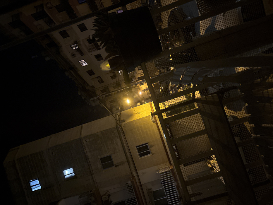 A nocturnal urban scene in Saint Paul's Bay, Malta, is depicted from an elevated vantage point. In the immediate foreground, a dark metal mesh railing spans the lower half of the frame. Positioned on the right side of this railing is a black potted plant containing multiple succulents, one of which incorporates a cylindrical light source emitting a yellow glow. Below the railing and slightly further back, a yellow streetlamp illuminates a portion of a building facade and a sign displaying the partial text "vanuu workshop". In the background, to the left, a tall, narrow building constructed of light-colored masonry rises against the dark sky. This building features at least three windows, with the two uppermost windows emitting a distinct blue-white light. To the right, another multi-story residential or commercial building is visible, characterized by multiple windows, several of which display warm yellow-white interior illumination. Balconies with railings are also present on this building. The overall environment is dark, indicative of nighttime, with artificial lights providing the primary illumination. No individuals are visible, nor are any direct actions or interactions.