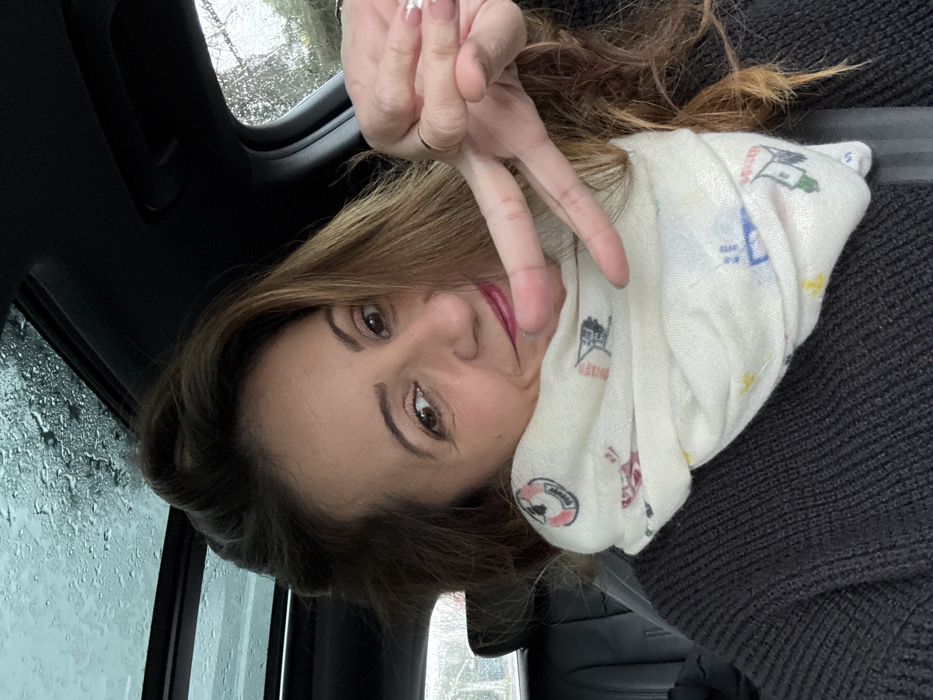 A female adult is depicted in a close-up, head-and-shoulders view from inside a vehicle, located in the city of Cachan, France. She possesses long, wavy brown hair, dark eyes, and light-toned skin, with a faint smile and light pink lipstick. She wears a dark, possibly charcoal, ribbed knit sweater and a cream-colored infinity scarf adorned with small, colorful, nautical-themed patterns, including a visible red and white lifebuoy and a lighthouse motif. A black seatbelt is visible across her chest. Her right hand is raised, forming a "peace" sign with her index and middle fingers extended. A thin gold-colored ring is present on her right ring finger, and her fingernails display a French manicure. The overhead sunroof and side windows of the vehicle are covered with raindrops, indicating exterior precipitation and an overcast environment. Blurred green foliage and indistinct background elements are visible through the windows. The interior of the vehicle features dark trim and a black headrest.