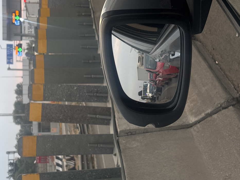 The image depicts a static scene from the interior of a vehicle at a toll plaza on a highway in Tultitlán, Mexico. The foreground is dominated by the dark-colored exterior side mirror of the vehicle, which occupies the lower right quadrant of the frame. A small chip is visible on the mirror's lower left edge. The mirror reflects a queue of vehicles in a lane behind and to the left of the viewer. This reflected traffic includes a white tow truck with an attached crane, followed by at least three red passenger cars, a dark grey/black passenger car, and a light grey passenger car. Further back, a white box truck or refrigerated truck is visible. The sky in the reflection appears overcast or hazy. Directly outside the viewer's vehicle, a concrete barrier separates the vehicle's position from the toll plaza infrastructure. Beyond this barrier, a series of tall, grey rectangular pillars with yellow reflective tops are arranged in a line, suggesting a lane divider or part of the toll gate structure. Behind these pillars, components of a toll plaza are visible, including toll booths and an overhead gantry system. Overhead signs on the gantry display "SOLO TAG" in blue, indicating an electronic toll collection lane, along with illuminated green arrows pointing downwards, signifying open lanes. The overall sky is light and hazy. The environment suggests a functional highway setting during daylight hours, characterized by ongoing traffic flow (as seen in the reflection) and toll collection infrastructure. No individuals are explicitly visible in the frame.