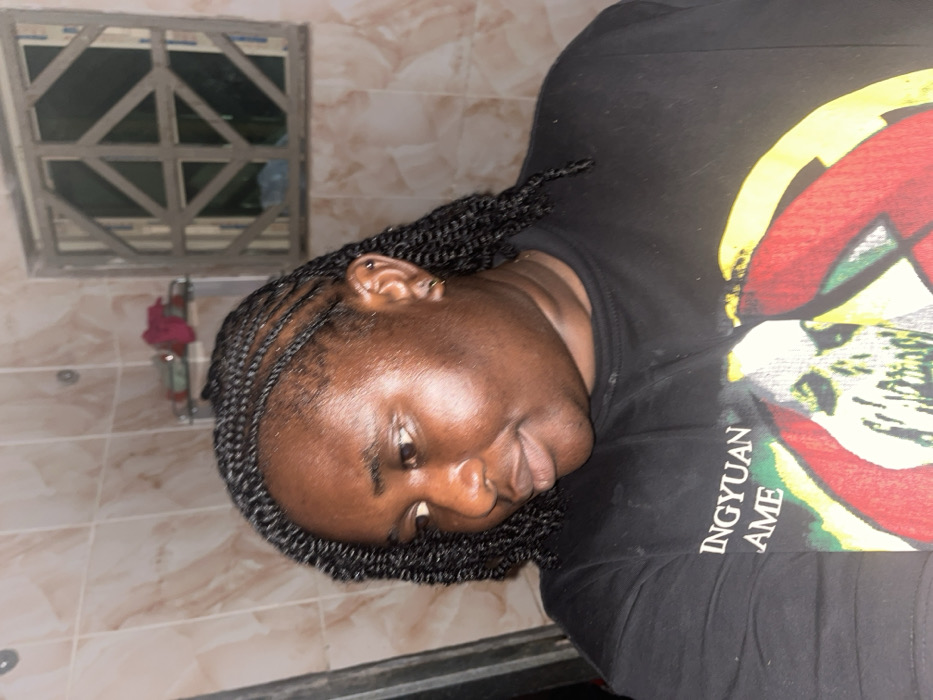 An individual with dark skin and black hair styled in numerous small braids and cornrows is depicted from the mid-chest upwards, looking downwards and to the left