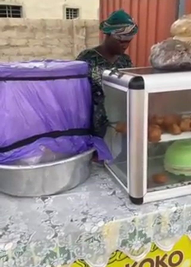 woman standing behind a food cart. She is wearing a headscarf and a dark-colored patterned dress. The cart has a sign that reads "HAUSA KOKO". There is a display case on the cart filled with round, fried food items. There is also a large metal bowl covered with a purple bag on the cart. In the background, there is a building with windows and a red container. The woman appears to be preparing or serving food at the cart.