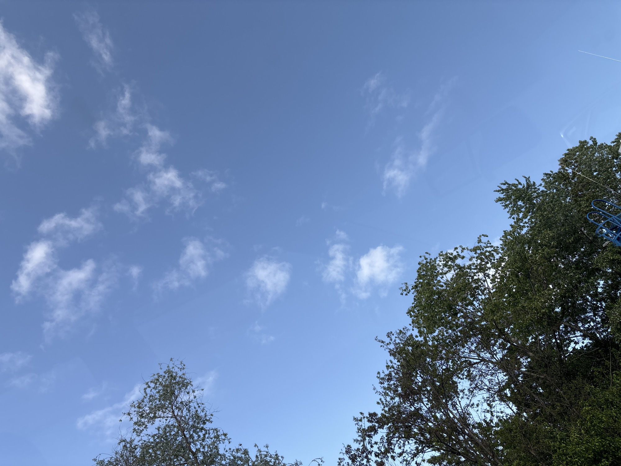 The image presents a view of a clear blue sky with scattered cumulus clouds. The lower portion of the frame contains the tops of trees with green foliage. Some blue metal structures are visible amidst the trees, suggesting the possible presence of playground equipment. It is not possible to determine the exact location in Plovdiv, Bulgaria from the image provided. There are no people visible in the scene.