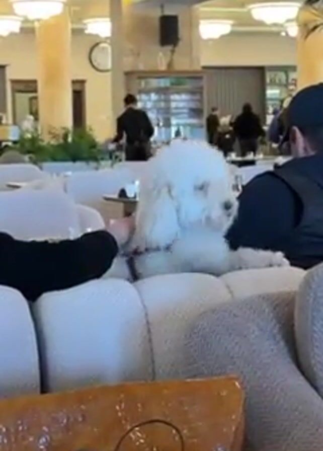 white, curly-haired dog sitting on a cushioned sofa in what appears to be a hotel lobby or lounge area. A person wearing a black shirt is petting the dog, while another person in a black cap sits nearby. There are other people scattered around the room, seated at tables, and a person in uniform working behind a bar area in the background. The room has high ceilings, decorative lighting, and a clock on the wall. A bag with writing on it is visible on the sofa. The camera slowly pans upwards and to the right.