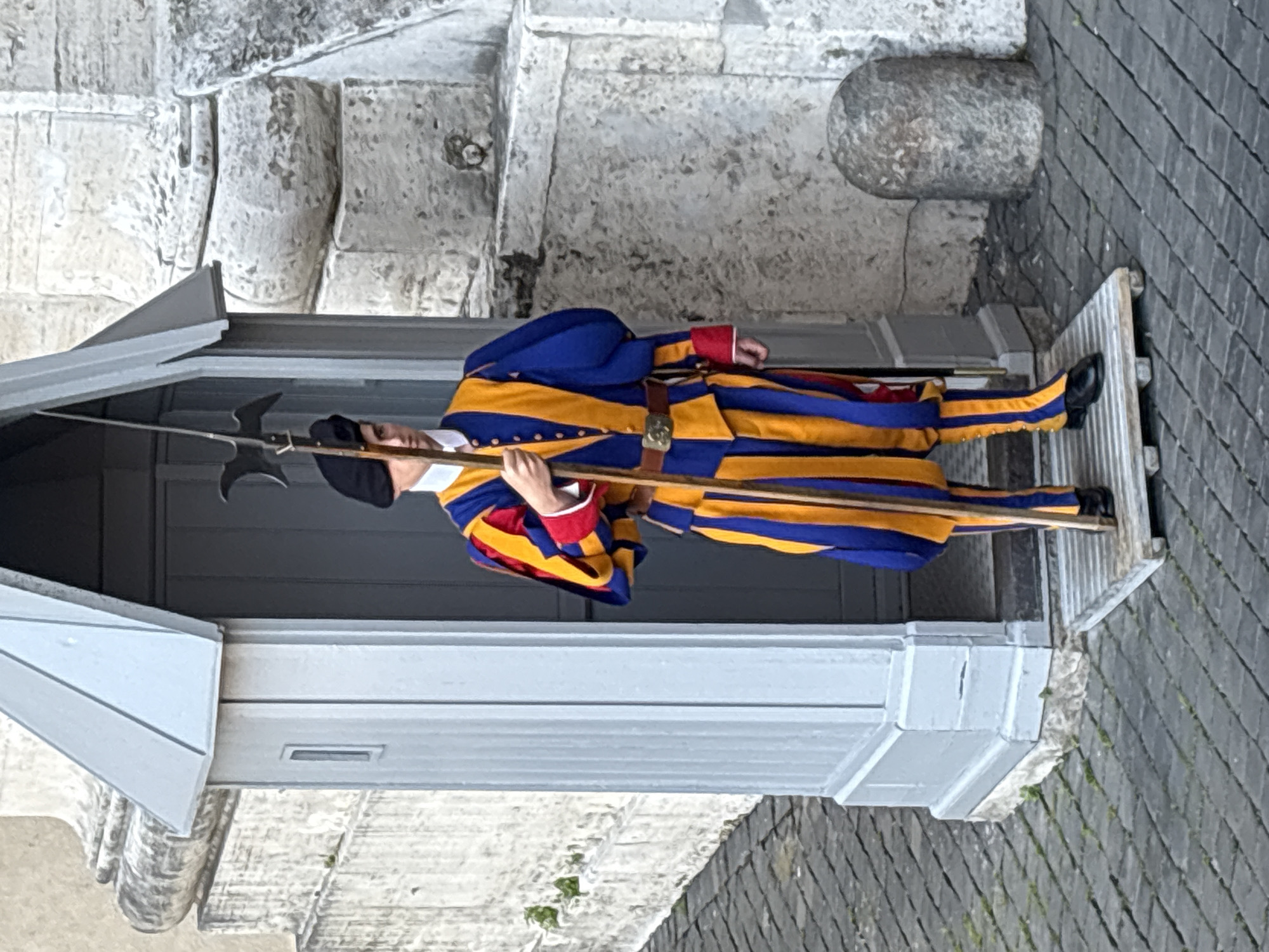 A full shot shows a Vatican Swiss Guard standing guard