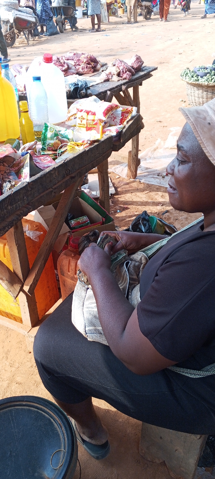 A woman in a black shirt and a sun hat sits on a wooden stool in a busy market. She holds a wad of cash secured with a rubber band in her hands, counting it. Her bag rests on her lap. A wooden table displays various goods for sale, including meat, cooking oil, spices, and other food items. In the background, other people and market stalls contribute to the lively atmosphere.