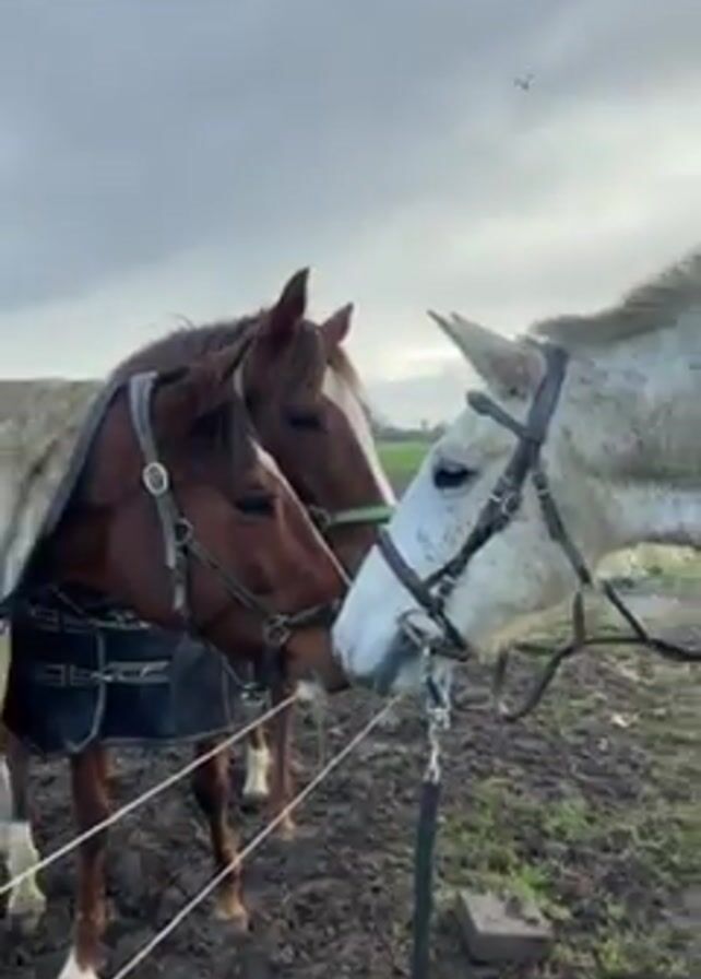 three horses standing close to each other in a muddy field. Two of the horses are brown and wearing blankets, while the third is gray. The horses are all wearing bridles and appear to be nuzzling each other's faces. They are standing near a fence made of what appears to be thin metal wire. The sky is overcast.