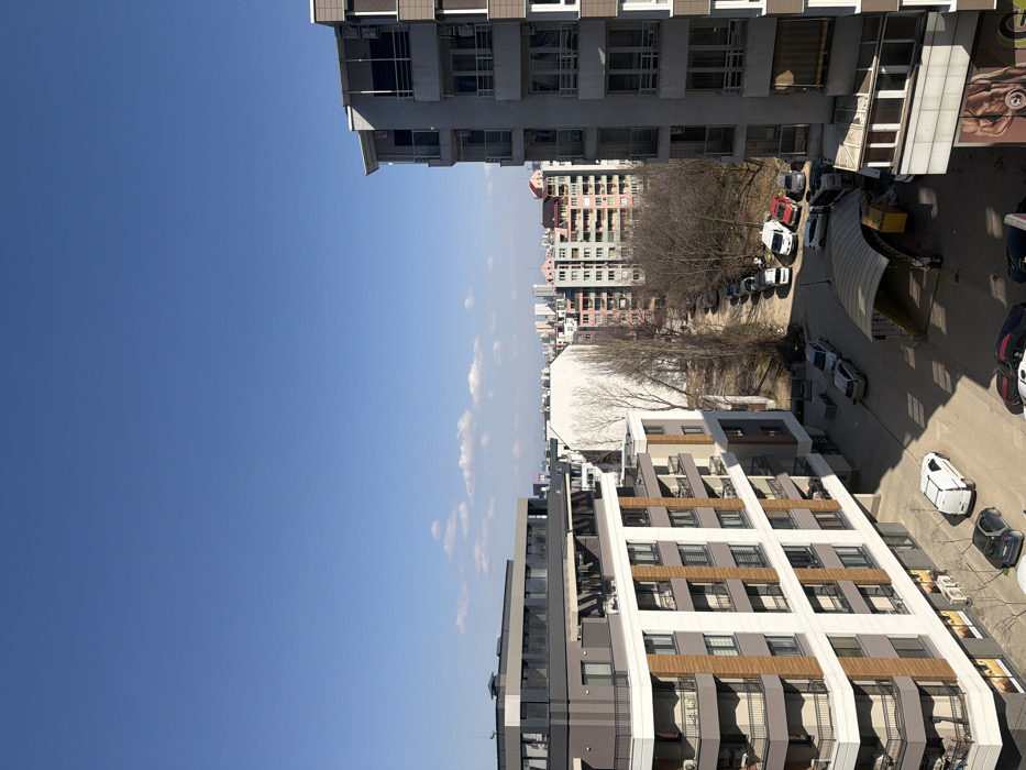 An elevated, wide-angle photograph captures a residential area in Sofia, Bulgaria, under a clear blue sky marked by sparse cumulus clouds. Strong sunlight illuminates the scene, casting distinct shadows and indicating a late winter or early spring season due to the leafless deciduous trees. In the immediate foreground, two multi-story residential buildings frame the view. The building on the left is modern, characterized by light-colored and brown facade panels, dark window frames, and glass-fronted balconies. An antenna protrudes from its roofline. The building on the right, predominantly light grey, also features balconies, and a large graphic depicting a muscular figure is visible on its lower exterior wall. Between these foreground structures, a paved street accommodates several parked vehicles, including a white delivery van. In the midground, a curved, light-colored overhead shelter covers a small area, with a yellow industrial container positioned nearby. Beyond this, a tree-lined, unpaved or gravel road winds through a park-like section, densely lined with parked cars. The midground and background present a dense urban environment featuring various multi-story apartment buildings. A prominent, large white structure with a curved or dome-like roof stands out amidst these, which include older buildings exhibiting pastel hues. The distant background reveals a skyline of taller, more contemporary city buildings. No individuals are visibly present, and no active interactions are discernible.