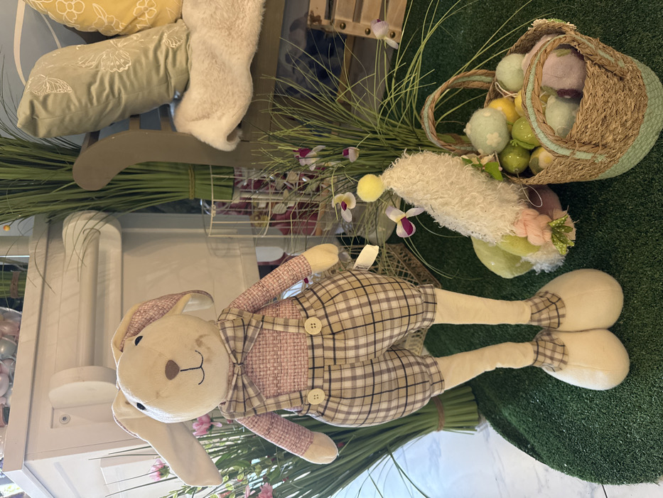 This image captures a seasonal retail display in the city of Kranevo, Bulgaria, featuring a large, cream-colored plush rabbit standing upright on artificial green turf. The rabbit wears a light pink checkered shirt, brown and cream plaid overalls with two light-colored buttons on the chest straps, and a matching plaid bow tie. Its stitched facial features include black eyes, a brown nose, and a simple mouth. A white tag hangs from its right side. To the right of the rabbit, a woven basket with light green accents contains various decorative eggs or spherical objects in pastel shades of light green, yellow, lavender, and light blue. Partially visible near the basket is a decorative figure, possibly a gnome, with a shaggy white body, a yellow pom-pom hat, and a pink and green braided tail. Artificial green plant stalks, some with small purple and white flowers, are arranged around the basket and behind the rabbit. In the background, a white wooden display cabinet or structure is visible behind the rabbit, alongside a tall bundle of artificial green grass tied with a green string. To the far right, a light brown wooden bench draped with a light beige faux fur throw holds a light green pillow with white butterfly patterns and a yellow pillow with a floral design. Another bundle of artificial green grass is contained within a white wire basket behind the rabbit's right side.