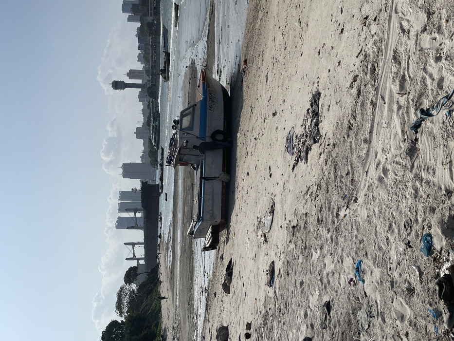 The image displays a coastal scene in Dar es-Salaam, Tanzania, under a clear to partly cloudy daytime sky. In the immediate foreground, a sandy beach is visible, heavily interspersed with scattered litter including various plastic items and fabric debris. A white and blue utility vessel, partially identified by the name "MV SALAH" on its hull, is beached on the sand and exposed mudflats. A male individual, dressed in dark clothing, stands on the vessel's port side, facing towards its hull. In the midground, the water's edge, indicative of low tide, features several smaller boats either beached or partially afloat in shallow water. Further out in the bay, a large, dark cargo ship equipped with multiple cranes is observed, and a green and white passenger ferry moves across the water from right to left. The background presents the distinctive urban skyline of Dar es-Salaam, characterized by a cluster of three modern high-rise buildings and a tall, cylindrical communication or port control tower.