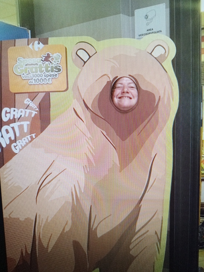A person's head, specifically a smiling face with fair skin and short hair, is visible through a circular cutout in a large, light-brown, cartoon-style bear standee. The standee features dark brown outlines and shading, depicting the bear's body. To the left of the bear, a brown promotional panel is attached, displaying the "Carrefour" logo at the top. Below the logo, white and yellow Italian text reads "Super GRATTIS Vinci 1000 spese da 1000€" (Super Scratch-off Win 1000 shopping trips of 1000€). Further down the panel, the word "GRATT" is repeated multiple times in white text. In the upper right background, a white sign with a black border shows a CCTV camera icon and the Italian text "AREA VIDEOSORVEGLIATA" (Video-surveilled area). The overall scene takes place indoors, against a plain light-colored wall, indicating a commercial environment, likely a Carrefour supermarket in Strasbourg, France. The person is actively posing for a photograph.