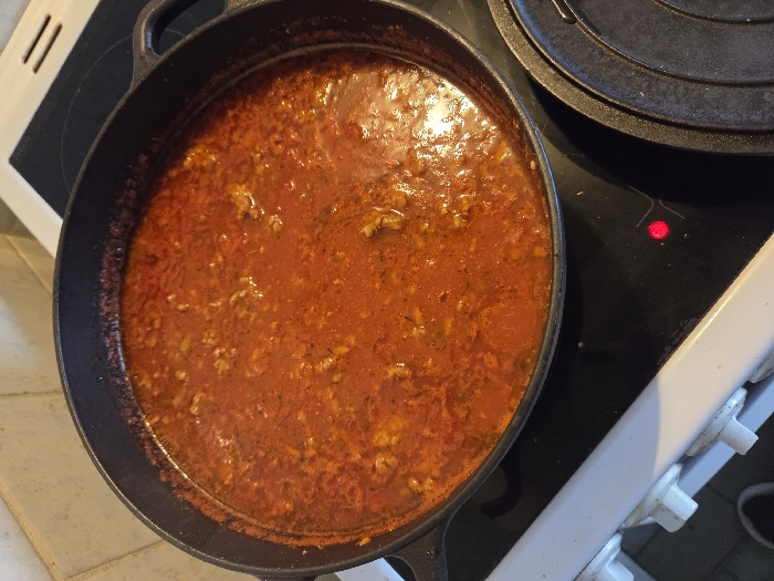 - "A close-up, high-angle view depicts a large, round, black pot, likely cast iron, filled with a simmering, reddish-orange sauce or stew containing small solid particulates" by FM-hW5fH2, licensed under CC BY 4.0