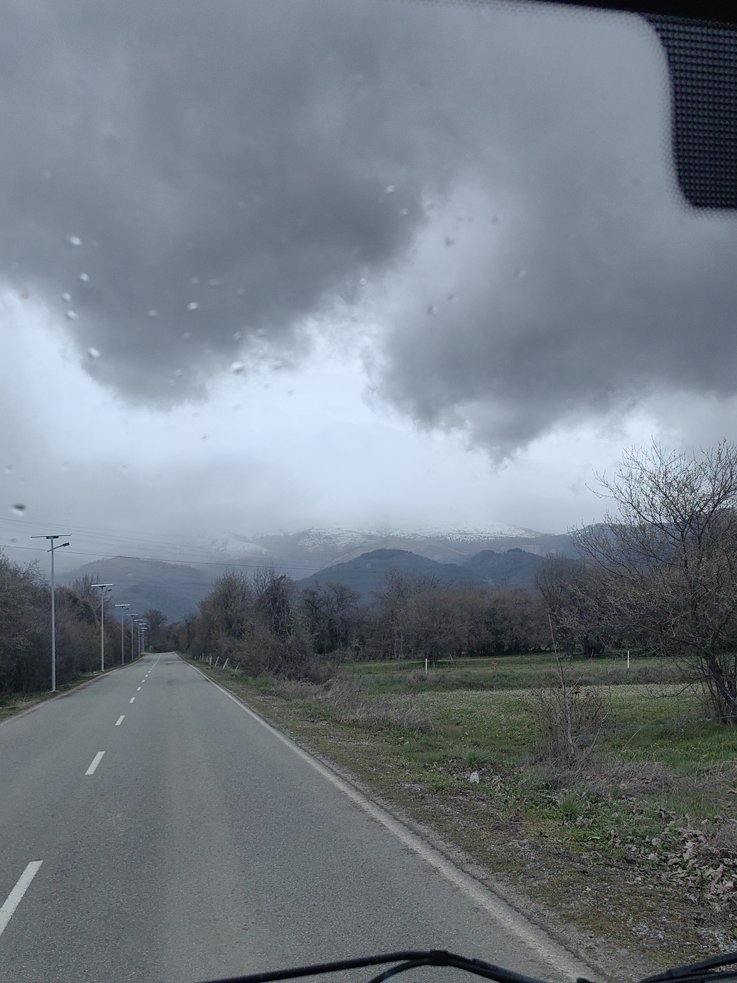 The image, likely taken from inside a vehicle, presents a rural road scene under a heavily overcast sky. Raindrops are visible on the windshield. The road is gray asphalt with white lane markings, stretching into the distance with a slight downward slope. To the left of the road, there's a row of evenly spaced utility poles. The vegetation on either side of the road consists of bare trees and shrubs with some patches of green grass and other ground cover. In the background, a range of mountains is visible, partially obscured by fog, with some snow visible at the peaks. While it is not directly identifiable as such within the frame of the image, the location is assumed to be Mirkovo, Bulgaria. No people, specific actions, or interactions are visible in the provided image.