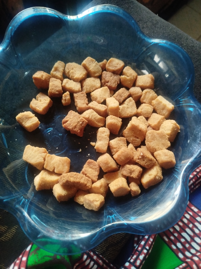 A vibrant blue bowl filled with small, square-shaped fried dough pieces. The treats vary in color from a light golden-brown to a slightly darker, toasted hue. They appear crispy and dry. The bowl itself features a scalloped edge and visible light reflections. The scene is set on a surface partly covered with a patterned cloth featuring colors like green, red, and blue. A section of what appears to be grey clothing is visible in the background.
