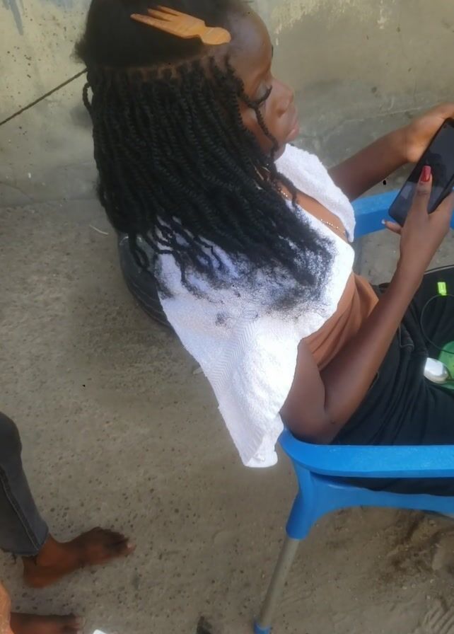 A person is braiding another person's hair outdoors on a concrete surface. The braider, sitting on an orange plastic chair, is wearing jeans and has a black bracelet. They are braiding hair with their gloved hands. The person getting their hair braided is sitting in a blue plastic chair, looking at a smartphone, with a white towel covering their braids. A comb is stuck in their hair. The area is otherwise bare.