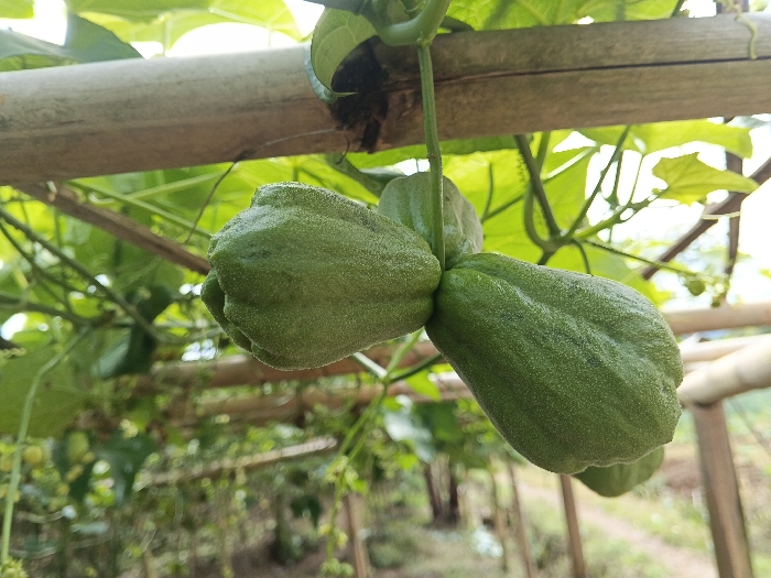 Two green chayote squash hang from a vine supported by a bamboo structure. One squash is rounded and bumpy, while the other is more elongated with longitudinal ridges. Green leaves and vines surround the squash and structure. The background features a blurred view of a garden or agricultural setting, with more bamboo structures and green foliage visible.