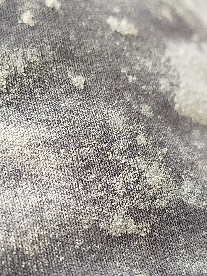 The image, captured in Šušanj, Montenegro, provides a high-magnification, detailed view of a dark grey textile material. The fabric displays a consistent, finely textured knit or weave pattern. Scattered across the surface are numerous irregular patches and individual specks of white, granular residue. This residue varies in concentration and size, appearing both as isolated particles and in denser clusters adhered to the textile fibers. The focus is sharp on the fabric's texture and the residue. No individuals, explicit actions, or broader environmental elements beyond the fabric surface are depicted.