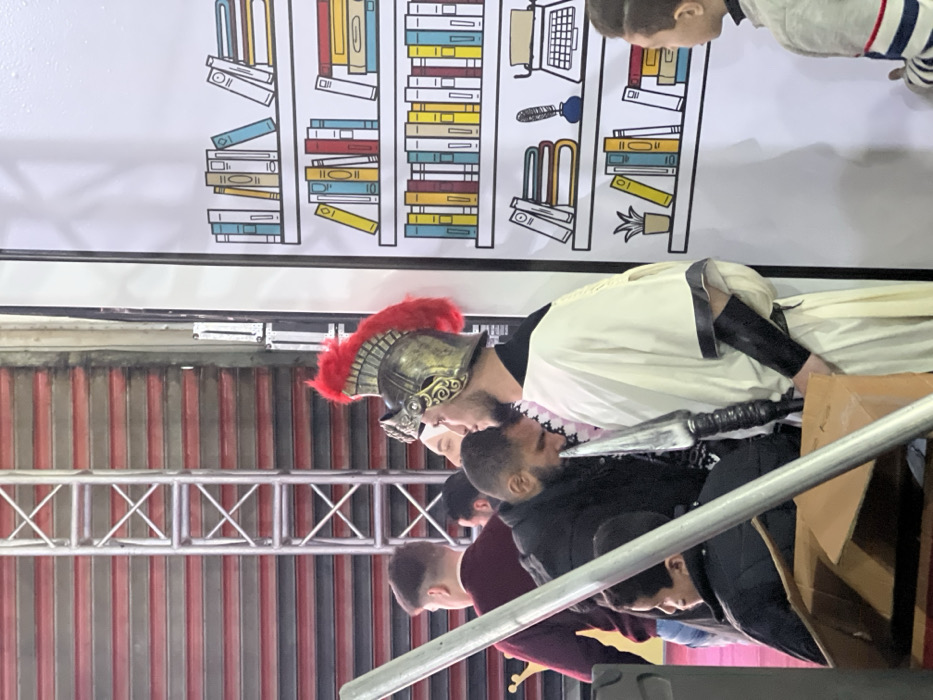 A line of individuals descends a staircase. The first person is dressed in a Roman soldier costume, complete with a helmet with a red plume and a tunic. The background features vertical stripes and a banner depicting bookshelves filled with various items.