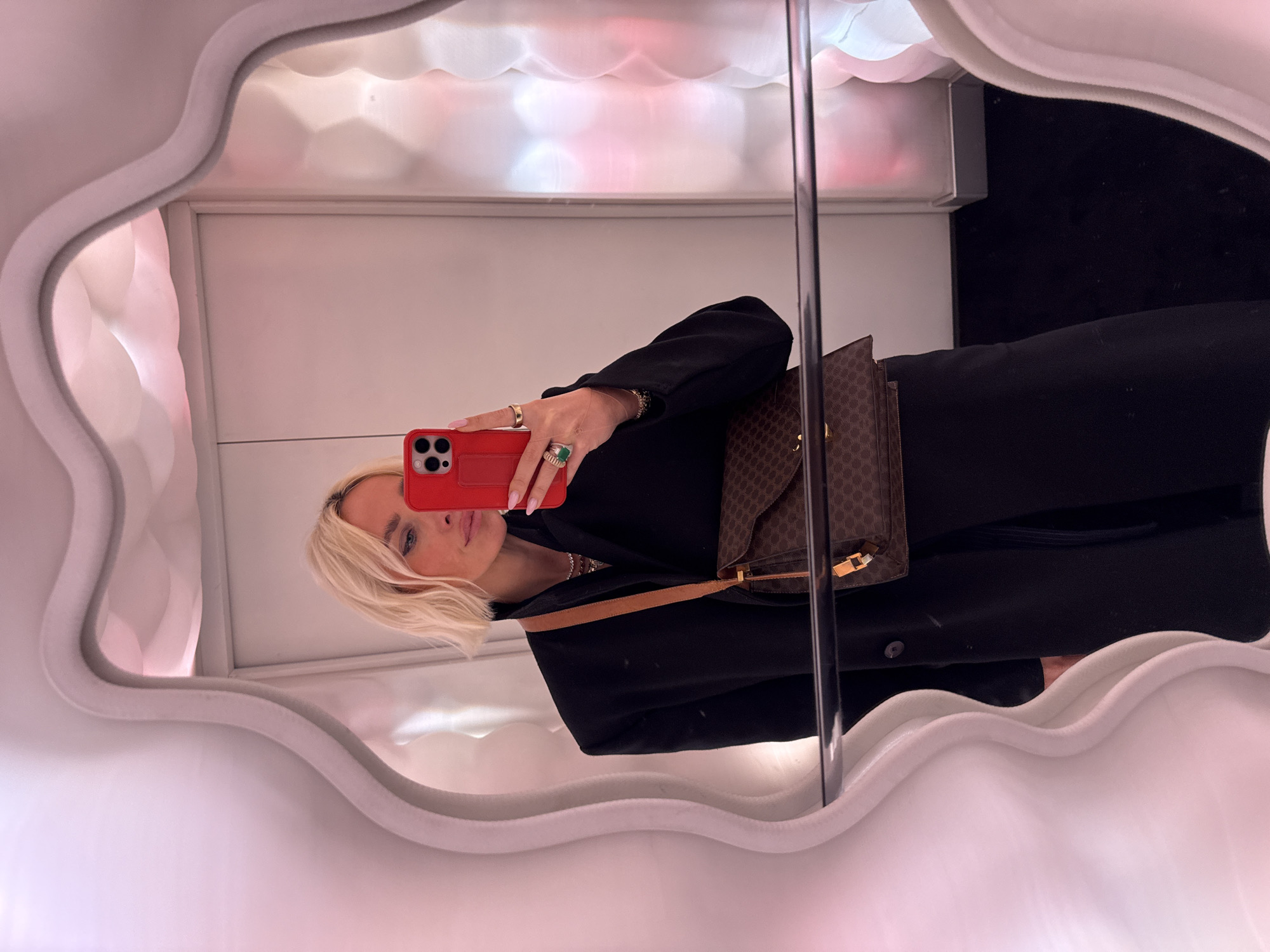 A fair-skinned individual with short, wavy blonde hair, wearing a black long coat and layered necklaces, takes a selfie in a mirror. The individual holds a red smartphone with a red case in their right hand, displaying light pink manicured nails and multiple gold rings, including one with a large green stone. A brown monogrammed shoulder bag with a tan strap is worn across the body. The mirror features a prominent, irregularly wavy white sculptural frame. The reflected environment consists of a flat white wall on the left, a textured, undulating surface with soft pink and white ambient lighting on the right, and a dark floor. A horizontal silver bar is reflected in the lower-middle section. The specific location within the city of Unknown, Unknown, is indeterminate but appears to be a modern interior space.