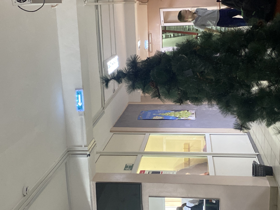 The image displays an interior hallway, likely within a public building or school, located in the city of Ольховка, Russia. A large, dark green artificial Christmas tree with visible pinecones stands prominently in the mid-ground, largely undecorated. To the right of the tree, a young male, approximately 8-12 years old, with light hair, is visible from the waist up, wearing a light grey collared shirt and dark blue trousers. He faces left, exhibiting an open-mouthed smile or laugh. Behind the Christmas tree, a blue poster featuring a green Christmas tree graphic is affixed to the wall. On the left side of the hallway, a glass-paneled door with an opaque white lower section leads to an interior room. A black plastic waste bin is situated next to this door. A small green 'H' symbol is visible on the door frame. Above, a black screen or monitor is mounted on the wall, and below it, a reflective surface shows a partial reflection of an individual wearing a white-collared garment. The ceiling is white, equipped with fluorescent light fixtures and a smoke detector in the upper left. A prominent, illuminated green exit sign with a left-pointing arrow is mounted high on the wall. Further down the hallway on the right, an open doorway leads to another area, above which a blue exit sign with the Russian word "ВЫХОД" and a right-pointing arrow is visible. White electrical conduit runs along the ceiling and upper walls.