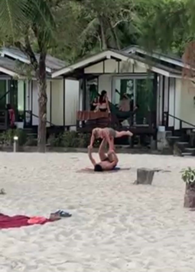 man and woman performing partner acro yoga on a sandy beach. The man is lying on his back with his legs extended upward, acting as a base. The woman is balanced on his feet and hands, holding a pose with one leg extended straight out to the side. They are centered in the frame with small white cabins and palm trees in the background. Several people are on the porch of one of the cabins, and a hammock is strung between two posts on the porch. A towel and other items are spread on the sand near the couple.
