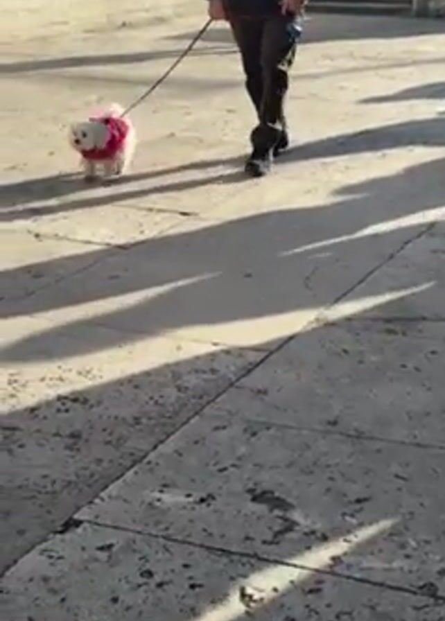 small white dog walking on a leash with its owner in an outdoor setting. The dog is wearing a bright pink vest or jacket. The owner is a person wearing dark clothing and shoes, holding the leash. Another person wearing jeans and brown shoes walks past in the opposite direction. The ground is paved with large, light-colored stone slabs, casting long shadows. The overall setting appears to be a public space, possibly a plaza or walkway.