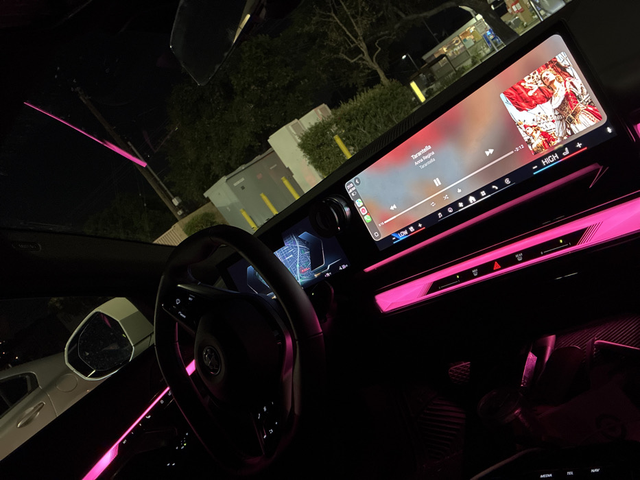 The image displays the interior of a vehicle, from a driver's or front passenger's perspective, looking forward into a commercial urban environment at night in Glendale, United States of America. The vehicle's interior is dominated by pink ambient lighting along the dashboard, the center console, and behind the steering wheel. The multi-function steering wheel is black with a central emblem and visible controls. To the right of the steering wheel, a digital instrument cluster displays a stylized map or navigation interface. Further to the right, a large, curved touchscreen infotainment display is prominent, showing a music application playing "Tarantella" by Anna Regina, with corresponding album art featuring a person in ornate red and white attire. Playback controls and a "HIGH" setting for what appears to be seat heating are visible on this display. Below the main screen, a strip of physical controls with pink backlighting includes a red triangular hazard light button. A reflective surface, possibly a mobile phone, rests at the bottom left of the center console. Outside the vehicle, through the windshield, the scene is dark, illuminated by various external lights. A light-colored drive-thru building with distinct yellow vertical stripes is visible directly ahead and to the right. Dark green trees and shrubs are situated between the vehicle and the building. To the far right, parts of other commercial establishments with illuminated signs are discernible. A white vehicle is partially visible through the side mirror on the left. In the upper right corner, a utility pole is visible, displaying a bright pink reflection, likely from the vehicle's interior ambient lighting cast onto the windshield or an external light source. No people are visible in the scene.