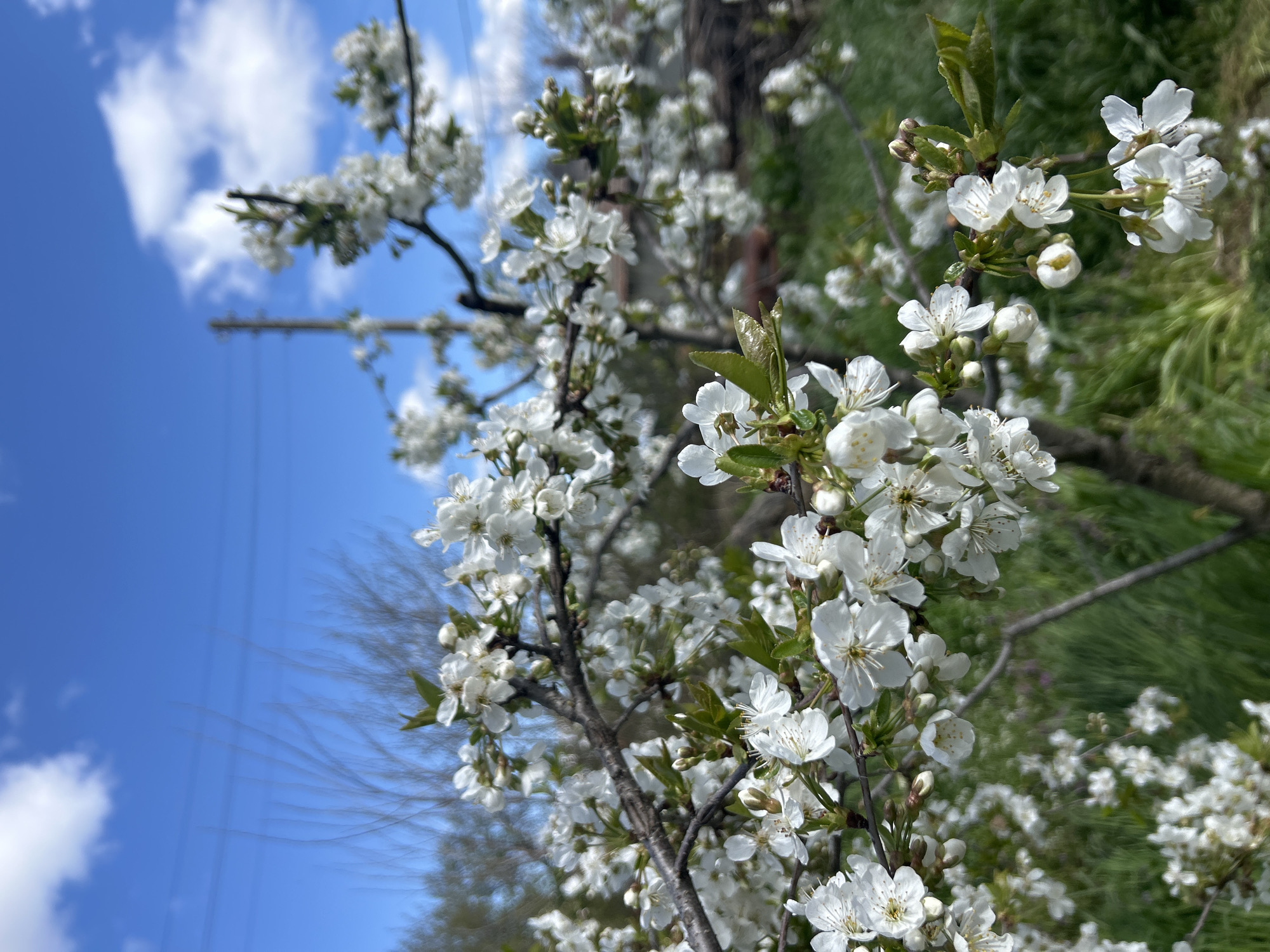 The image depicts a flowering tree, likely a cherry or plum tree, in full bloom with white blossoms. The tree is situated outdoors, with a backdrop of clear blue sky with scattered white clouds. In the distance, power lines are visible against the sky. The foreground features green vegetation, suggesting a grassy area or field. The photo was possibly taken in the city of Asenovets, Bulgaria, but there is no direct, visible evidence of this in the image itself.