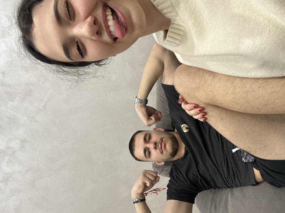 The image portrays two individuals, a female and a male, in a casual indoor setting. The female, positioned in the right foreground and appearing to take the photograph, has dark, wavy hair and wears a light-colored (cream/off-white) ribbed sweater. She is smiling broadly, with her eyes partially closed and her tongue slightly extended. Her right hand, with dark red painted nails, rests on the male's leg. Her legs, crossed and with visible hair, are prominent in the foreground. The male is seated on a grey sofa or large cushion in the left background. He has short dark hair, a mustache, and a short beard. He wears a black t-shirt featuring a small emblem on the left chest and black shorts. Both of his arms are bent, flexing his biceps, with clenched fists. His left wrist is adorned with multiple bracelets, including one with red and white fabric, while his right wrist sports a silver-toned metal watch. He maintains a neutral expression, looking towards the camera. His legs are visible, also with discernible hair. The background consists of a plain, light-colored (beige/light grey) wall with a subtle textured finish. There are no visual cues within the image to specify a particular location in the city of Sofia, Bulgaria.