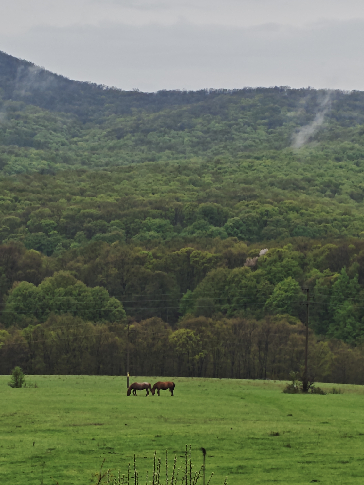 The image depicts a verdant landscape, likely located in a rural or semi-rural area of Izgrev, Bulgaria. In the foreground, two horses graze in a sprawling green field. Behind the field rises a dense, lush forest that covers a low mountain range. The forest is primarily composed of green trees with the tops of brown trees peaking through. Mist or fog hangs in the air above the forest, creating a soft, diffused light. Two telephone poles are noticeable on the edge of the forest. The overall scene evokes a sense of peace and tranquility.