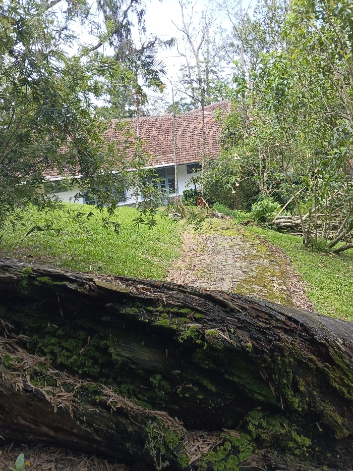 The image displays a verdant outdoor scene in the city of Unknown, Vietnam. In the immediate foreground, a substantial dark brown log, heavily covered in green moss and some dried leaves, lies horizontally across the lower frame. Behind the log, a narrow, unpaved pathway, likely composed of stone or flagstone, meanders upwards and into the distance towards a building. The path is partially obscured by scattered dried leaves and patches of moss. Lush green grass flanks both sides of the pathway, bordered by dense, varied foliage and numerous tall trees. To the right of the pathway, a pile of cut logs or branches is visible. In the background, partially concealed by the surrounding vegetation, stands a single-story building with light-colored walls and a prominent gabled roof constructed of reddish-brown terracotta tiles. Several windows with light blue frames are discernible on the building's facade. The entire scene is enveloped by dense greenery, including bamboo-like plants and other broadleaf trees, extending towards a bright, partly cloudy sky. No individuals or animals are present within the frame, and no discernible actions or interactions are occurring.