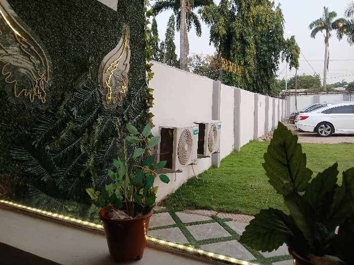 The scene depicts an outdoor area in Unguwar Rimi, Nigeria, viewed from an interior space through a window. In the immediate foreground, an illuminated LED strip light runs along a window sill, with two potted plants positioned on it; one contains small, light green leaves, and the other, partially obscuring the lower right, features larger, dark green leaves. Beyond the window, a textured green wall, likely artificial foliage, is visible. This wall features two upward-swept wing-shaped decorative elements illuminated with a golden light, possibly neon. To the right of the green wall, a stark white concrete wall with vertical dark grey support columns extends horizontally across the midground. Two grey air conditioner outdoor units are mounted on this white wall. A manicured green lawn occupies the ground space in front of the white wall, bordered by a pathway of square grey concrete slabs with grass infill. In the background, beyond the white wall, several vehicles are parked on what appears to be a paved lot; a white Honda Accord is prominently visible, along with another white car and a darker vehicle. Lush green trees, including tall palm trees, are visible above the wall and vehicles, and a yellow sign, partially obscured by foliage, bears text beginning with "THE DECOR". The sky is overcast or uniformly bright. No individuals are present.