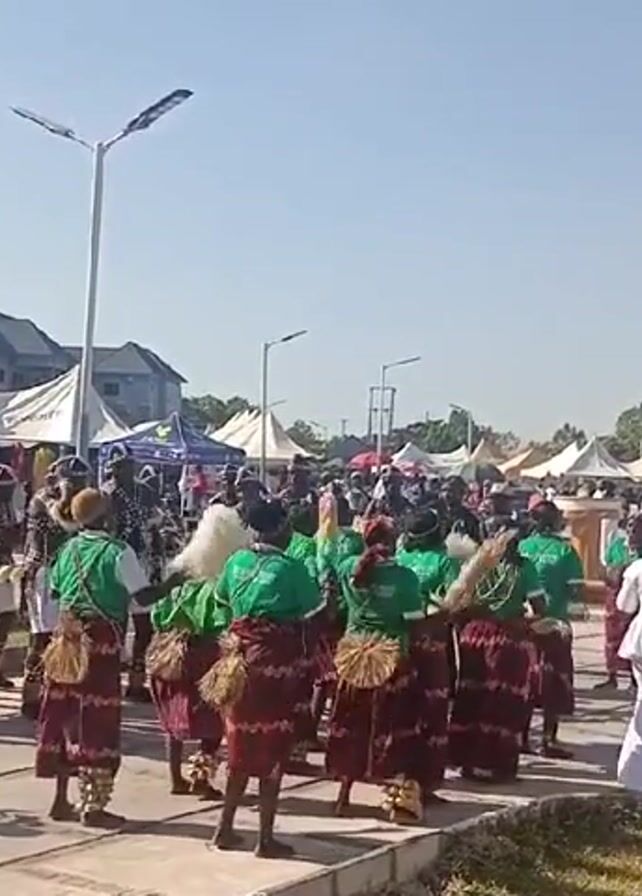 The video depicts a gathering of people, likely at an outdoor event. A group of dancers, some in traditional outfits and others in green shirts and patterned skirts, perform in the center of the frame. On one side, individuals in ceremonial dress and feathered headdresses are visible. Tents are set up in the background, suggesting a market or festival. A man with a camera is seen taking pictures of the dancers. The scene is bathed in bright daylight, indicating a sunny day. The dancers are the primary focus, with onlookers observing and participating in the celebration.