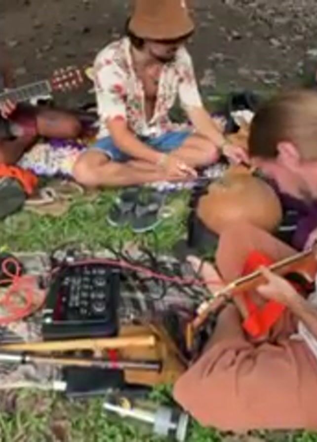 A group of five musicians sit on the ground outside, surrounding a patterned blanket. One plays an acoustic guitar, another a smaller lute-like instrument, and one sings into a microphone. In the center is a small soundboard, surrounded by various instruments including a flute and percussion tools. They seem to be in a forest, with grass and loose debris on the ground.