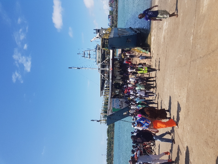 An outdoor, daytime image depicts a large passenger and vehicle ferry docked at a ramp within the Ganjoni/Shimanzi ward, Kenya, likely at the Likoni Ferry Channel. The sky above is clear blue with sparse white stratocumulus clouds. A multi-decked, grey and blue ferry, labeled with "The Ferry Is Free" and "Dial *721#", has its bow ramp lowered to connect with a concrete or compacted earth dock. A substantial crowd of approximately 100-150 individuals is actively disembarking from the ferry and walking onto the dock. In the immediate foreground, a person wearing an orange skirt and a blue patterned head covering walks towards the left, accompanied by another person in a brown, abaya-like garment. Another individual, wearing a blue shirt with "Chelsea" visible and a light-colored skirt, walks towards the right foreground, separate from the main disembarking group. Among the disembarking passengers, one person wears a yellow high-visibility vest. Several bicycles are visible among the crowd on the left side of the ferry ramp. The water body surrounds the ferry, and land with visible vegetation is present in the distant background across the water.