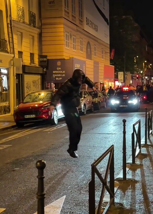 A person in dark clothing and a hood walks along the top of metal posts in the street at night. Cars and other people are visible in the background. The person in dark clothing is seen walking along the median strip of metal posts which separates the parking lane from the driving lanes. The street is lit by streetlights and the lights of the vehicles. The person appears to be balancing along the tops of the posts.
