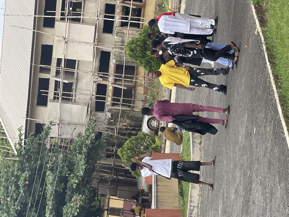 The image depicts an outdoor scene in Awka, Nigeria, featuring a group of individuals in a paved area with a building under construction in the background