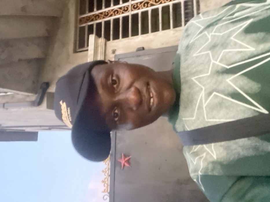 A smiling man wears a baseball cap and a green shirt with white star patterns. The cap has a gold-colored design on the front. A black strap goes across his shoulder. He stands outside a building with barred windows and a gate adorned with decorative metalwork, including a red star. The background includes stairs and a light blue sky. The image is rotated.