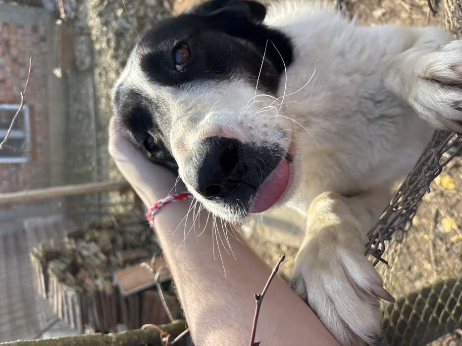 A black and white canine, possibly a mixed breed, is the primary subject, shown from the chest up