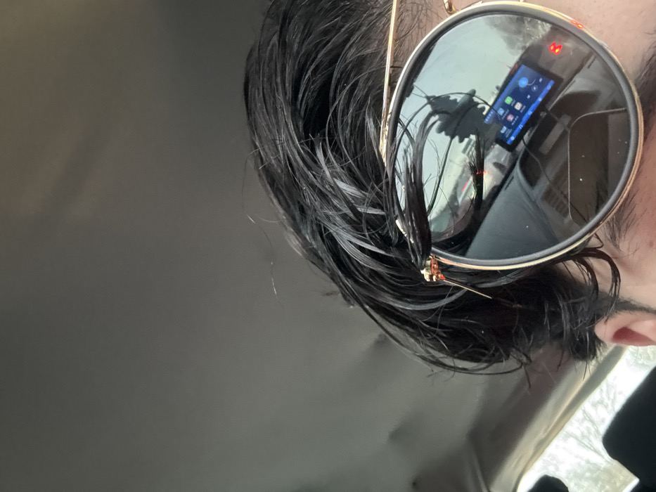 - "The image presents a close-up, angled view of the upper right side of an individual's head, specifically featuring their dark, tousled hair and the right lens of their aviator-style sunglasses" by FM-Pj81k2, licensed under CC BY 4.0