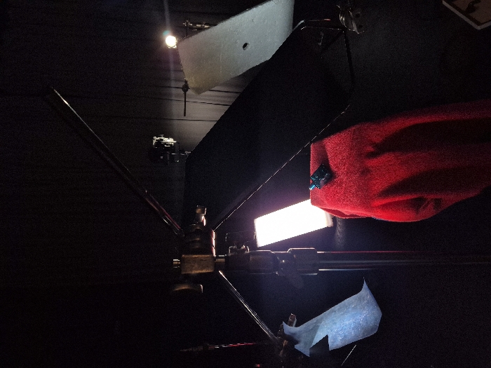 A dimly lit room features a complex lighting setup. Various lights are positioned on metal rigs with arms and clamps. A rectangular light source illuminates a portion of the scene, casting light onto a red cloth. A small white surface is positioned below the main light source. A second, smaller white panel is suspended from above. The overall composition is obscured by the darkness, focusing the attention on the illuminated sections.