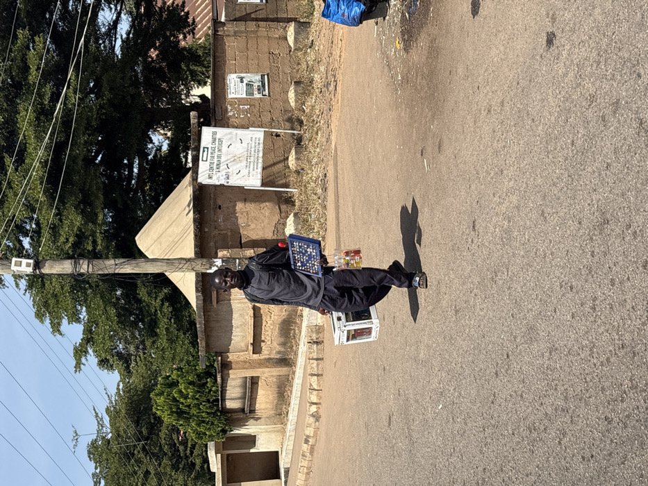 In New Stadium, Nigeria, a dark-skinned male individual, wearing a dark long-sleeved shirt, dark trousers, and dark sandals, walks on an asphalt road under bright daylight. He carries a black backpack. In his left hand, he holds a blue rectangular tray displaying numerous small, colorful items, likely jewelry. In his right hand, he carries a white rectangular cooler and a clear plastic bag containing multiple small bottles of colorful liquids. His shadow is cast to his rear-left. The background features a low concrete wall with a small green bush on the left, leading to a weathered light brown stone or mud brick wall. Behind this wall, a conical-shaped roof structure is visible. A light brown wooden utility pole with wires stands centrally. Two white signs are affixed to the wall; the primary sign reads "INT'L CENTRE FOR PEACE, CHARITIES & HUMAN DEV. (INTCEF)" along with address details including "ANAMBRA ESTATE, ABUJA, NIGERIA" and "WWW.INTCEF.ORG.NG". Dense green foliage from trees is visible under a clear blue sky. A dark blue plastic object and scattered debris are present on the far right of the scene.