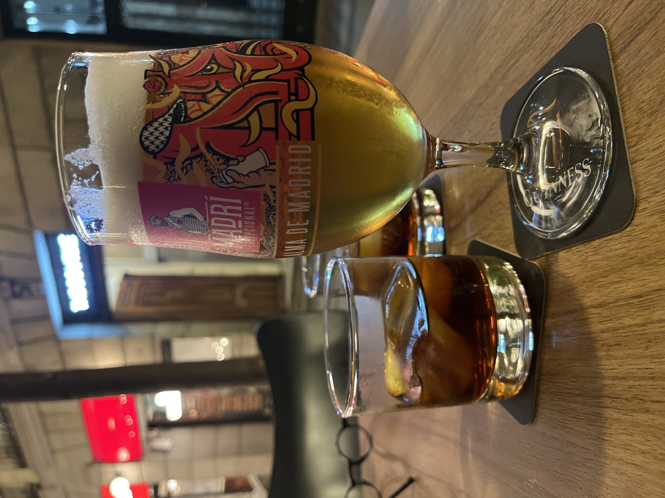 The image captures a close-up of a wooden table at an outdoor establishment in Madrid, Spain, during the evening or night