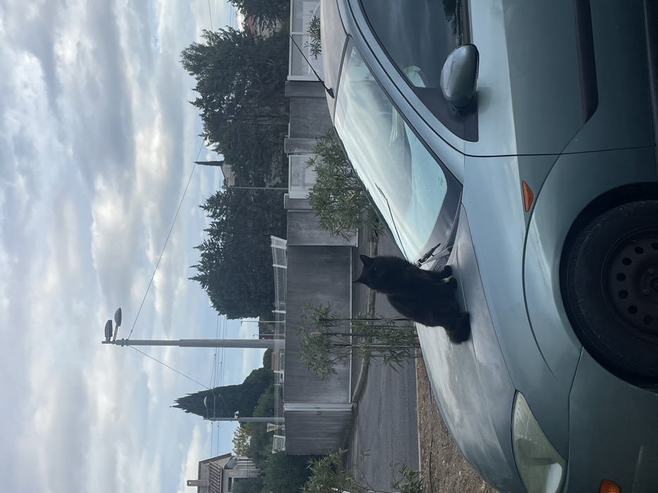 - "A black, long-haired cat is seated on the hood of a light blue-green Ford Focus hatchback" by FM-Nyolm2, licensed under CC BY 4.0