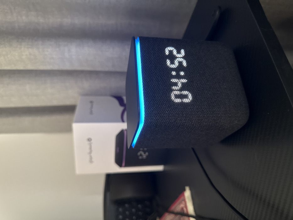 - "A black, cube-shaped smart speaker, textured with fabric and displaying "04:52" in white LED digits, is illuminated by a thin blue LED strip along its top edge" by FM-UFsim1, licensed under CC BY 4.0