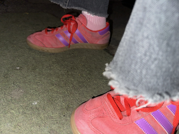 The image depicts a ground-level view of an individual's lower legs and feet positioned on a green, densely textured surface consistent with artificial turf, located in Yerevan, Armenia. The person is wearing dark grey jeans with visibly frayed cuffs that partially cover vibrant red suede athletic shoes. Each shoe features three distinct purple stripes on the lateral side, red laces, and light brown gum rubber soles. Light pink ribbed socks are visible between the jean cuffs and the collars of the sneakers. The scene is dimly lit, suggesting low ambient light conditions. The left foot is shown in a side profile, while the right foot is angled towards the viewer, with its forefoot partially obscured by the jean cuff.
