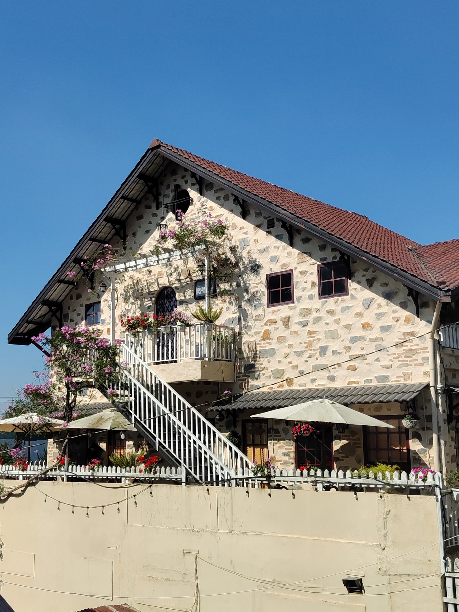 A two-story building, constructed of stone, is presented under a clear blue sky. The building features a steeply pitched, red-tiled roof with a black trim. A white, wrought-iron staircase ascends to a second-story balcony with a decorative railing adorned with potted flowers. The stone facade incorporates dark-framed windows. The base of the building features a tan wall with a white picket fence and potted plants. Patio umbrellas cover outdoor seating areas. The location is identified as Cam Ly - Đà Lạt, Vietnam.
